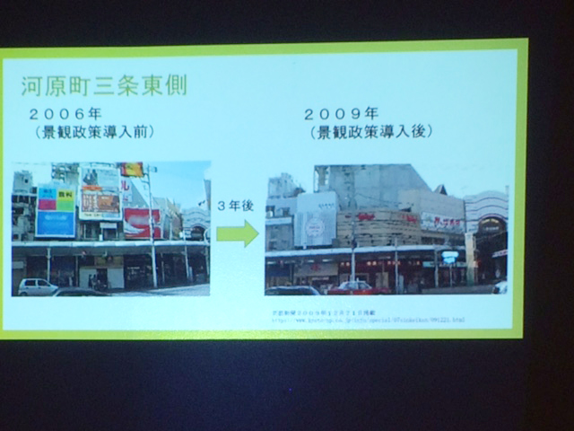 I introduced landscape regulation of Kyoto and chain store sign board designed for the Kyoto. There is cafe used Japanese houses that designated historical building. And we talked about conservation of Machiya.