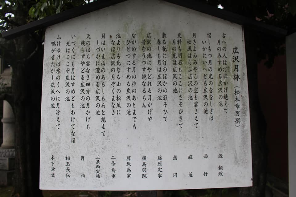 古くから月見の名所として知られ、藤原定家や後鳥羽院も広沢池の歌を詠んでいます。