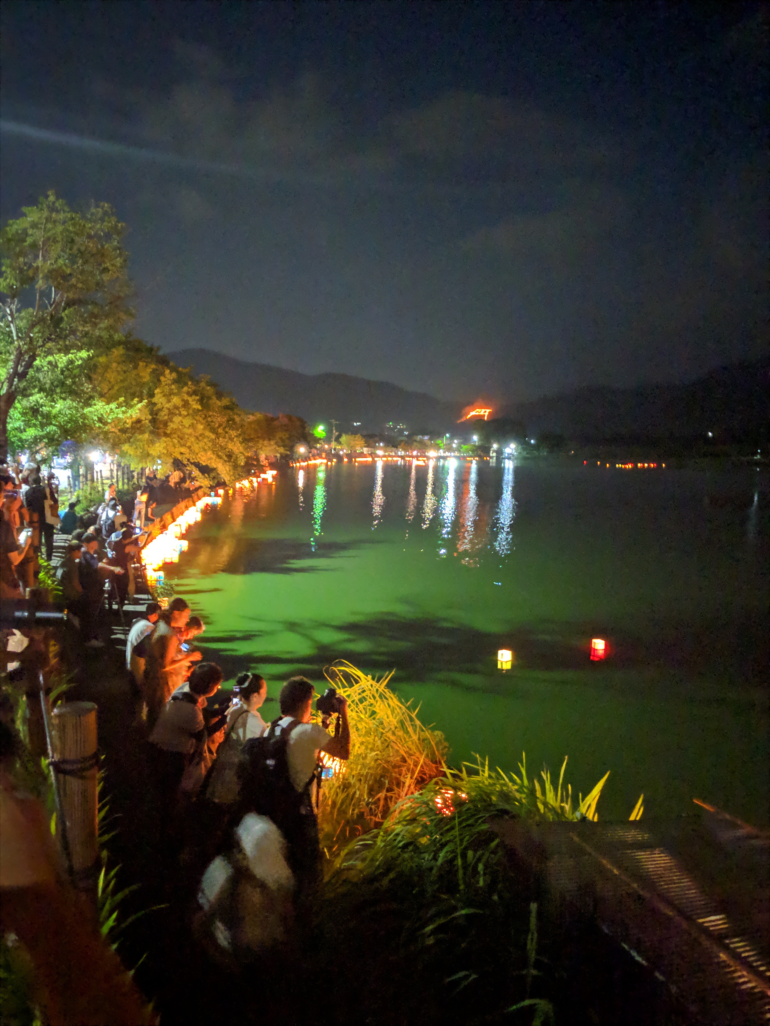 ここ広沢池では灯篭流しと鳥居形の送り火を拝むことができ、大勢の方で賑わいます。