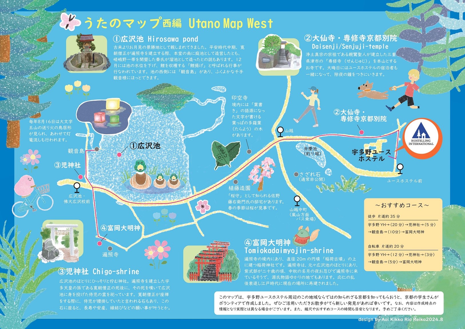宇多野ユースホステルの周辺イラストマップ:2024年に美大生徒一緒に作りました。館内で配架しています。