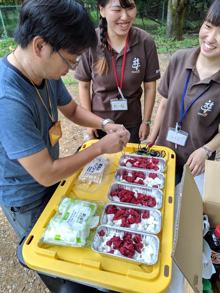 そしてBBQ講習会の開始。講師として(一財)ポジティブアースネイチャーズスクールの代表理事砂山さんに指導にあたってもらいました。