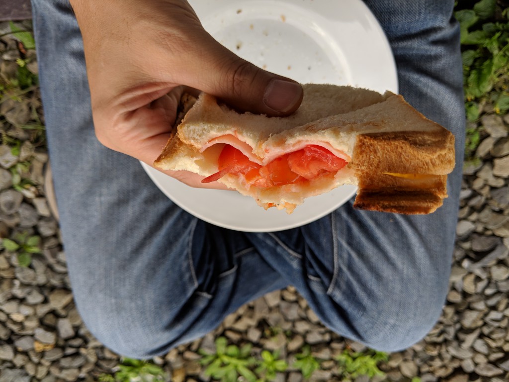 翌朝はちょっと小雨だったこともあり、軒下でホットサンドの朝食。