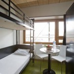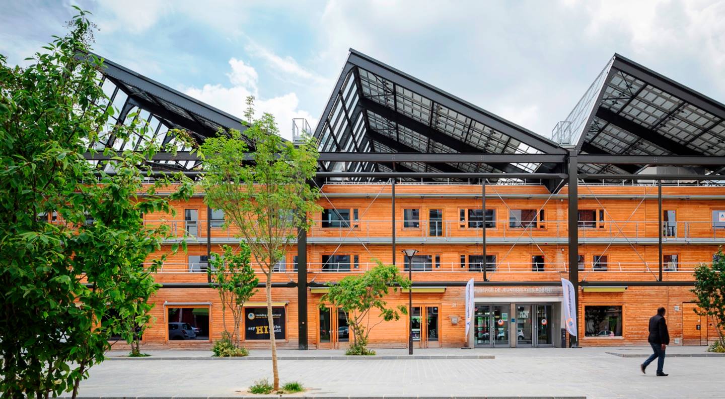 フランス、パリにあるイブロバートホステルはパリ北・東駅からほど近いフランス国鉄の鉄道倉庫を改築したユースホステルです。鉄道の元倉庫というくらいなので、目の前を高速鉄道TGVや近郊電車が走っているので「てっちゃん」にはたまりませんね。線路と建物の間の屋根は一部吹き抜けとなっており、その下が緑豊富なガーデンとなっていて遊歩道も整備され都会の中で日光を浴びながら緑も感じることのできる気持ちの良い空間となっているのも特長的です。昔の倉庫や工場らしいギザギザ屋根の上に敷かれた大型のソーラーパネルが館内の電力を賄っており、エコにも力を注いでいるホステルです。
