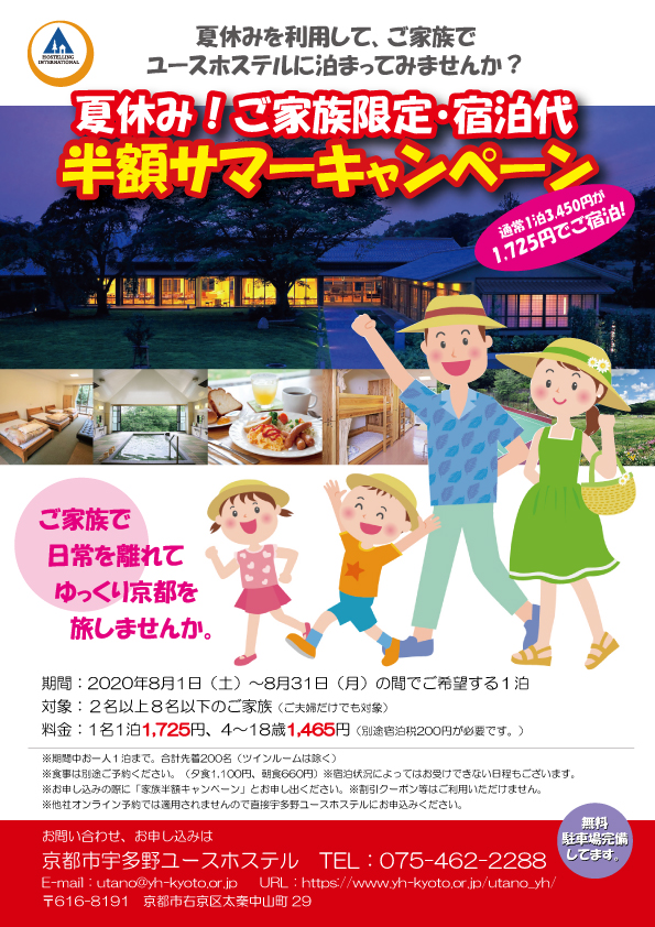 ※他社オンライン予約では適用されません。直接宇多野YHにお申込みください。