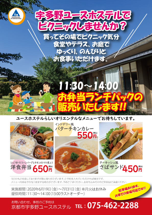 お弁当を購入いただき宇多野ユースホステルの庭やテラスで(もちろん食堂でもOK)お気軽ピクニック気分で楽しんでいただければと考えています。