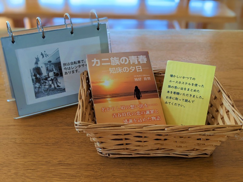 内容は恐らく半世紀ほど前の話かと思います。その時々で時代背景や生活スタイルの違いはありますが旅の中での人との出会いや交流はさほど昔も今も変わらないのかなと思います。談話コーナーに設置していますので、宿泊の際はお手に取ってもらえればです。
