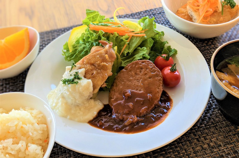 ■あつあつ煮込みハンバーグと、さくさく真鱈フリッターの「京の洋食御膳」