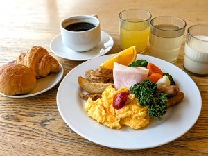 メニュー:パン各種・卵料理・ソーセージ等・温野菜サラダ・ポテト・フルーツ・シリアル・ごはん・お味噌汁・ジュース・コーヒー・紅茶・日本茶・牛乳 など ※内容は予告なく変更になる場合がございます。