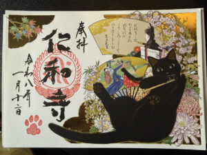 仁和寺を訪れたら、ぜひチェックしてほしいのが「猫」のエピソード。 宇多天皇は、日本最古の愛猫日記をつけたほどの黒猫愛好家だったそうです。「墨のように漆黒で、歩く姿は雲の上の黒龍のよう」と愛でていたんだとか。 そのエピソードをもとにした「黒猫の御朱印」が、いま大人気!高貴な雰囲気と可愛らしさのギャップがたまりません。