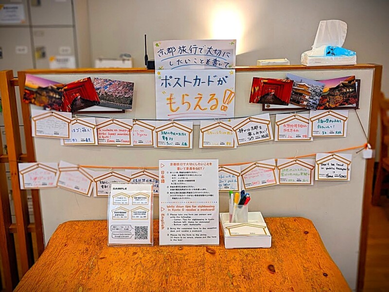 1. 想いを綴る: フロントでお渡しする専用のメッセージカードに、あなたが京都観光で「大切にしたいこと」や「意識したいマナー」を一言書いてください(例:「静かな街並みをゆっくり歩いて楽しむ」「伝統工芸の背景を知る」「ゴミを持ち帰る」など)。メッセージカードはフロントまたはロビーのテーブルに設置しています。