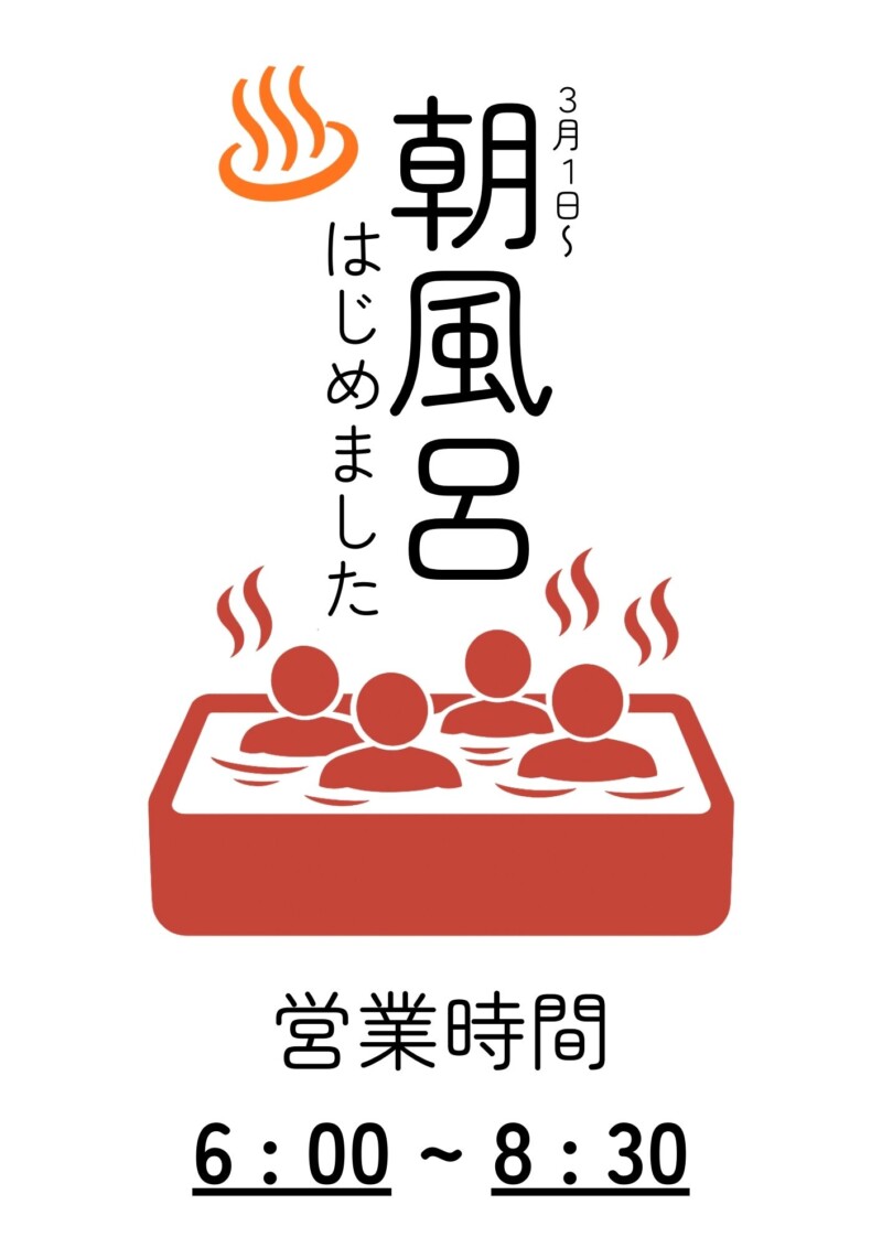 この度、大浴場におきまして朝風呂を再開いたしました。 朝食前に、ご出発前に、皆様ご利用ください。 入浴時間 6:00~8:30